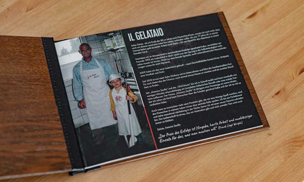 Für ein gehobenes Eiscafé haben wir eine Speisekarte entworfen, die das edle Ambiente widerspiegelt. Neben professionellen Fotos kamen hochwertiges Papier, Kraftpapier-Trennseiten und eigens gestaltete Icons zum Einsatz. Das Highlight ist die Präsentation in einem Holz-Klemmbrett mit eingraviertem Logo, das die Karte besonders macht.