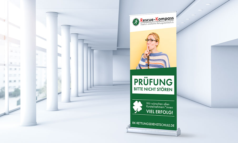 Für die Prüfungsphasen der Rettungsdienstschule haben wir ein Rollup gestaltet, das während der Klausuren Ruhe signalisiert. Es ist auffällig, klar verständlich und genau auf den Einsatzort abgestimmt. So trägt es dazu bei, dass Prüfungen in einer ruhigen Atmosphäre stattfinden können.
